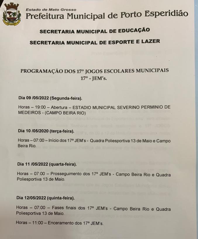 A Prefeitura Municipal de Porto Esperidião, por meio da Secretaria de Educação e Secretaria Municipal de Esporte e Lazer, vem comunicar a socidade nestes dias acontecera nossos Jogos, que dará inicio nos dias 09 à 12 de Maio.