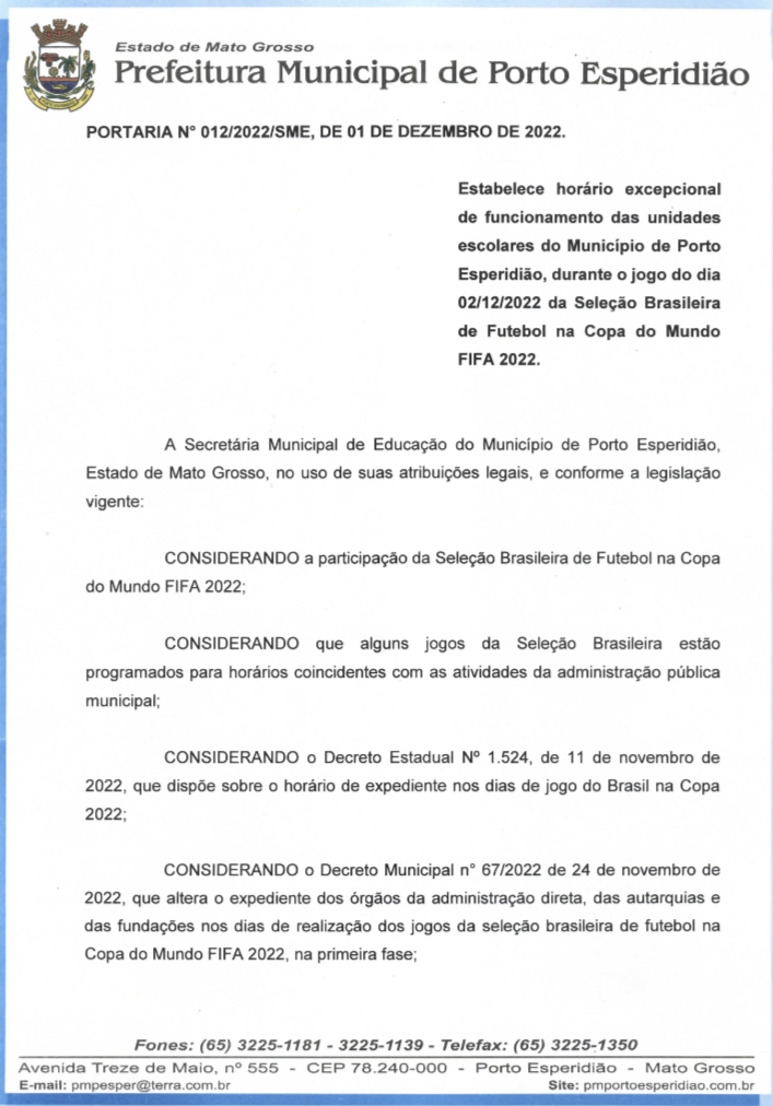 A Secretaria de Educação do Município de Porto Esperidião, estabelece horário excepcional de funcionamento das unidades escolares, durante o jogo do dia 02/12/2022 da Seleção Brasileira de Futebol na Copa do Mundo FIFA 2022.